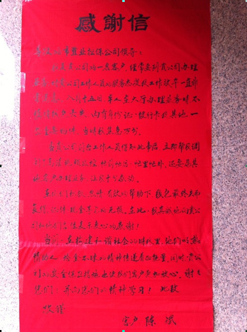 工作人員的熱情細(xì)致的服務(wù)態(tài)度,給陳斌先生及家人留下深刻印象。事后,為了表達(dá)感激之情,陳先生送來(lái)親筆抒寫的感謝信,寫道:“在構(gòu)建和諧社會(huì)的時(shí)代里,他們以熱情助人,拾金不昧的精神傳遞著正能量!同時(shí),安慶市房屋置業(yè)擔(dān)保公司的安全保衛(wèi)措施也使我們客戶更加放心!”